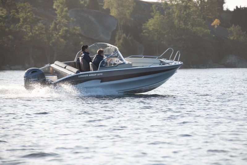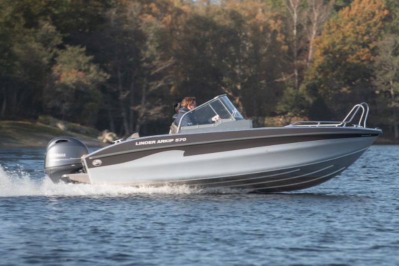 Nyheten Arkip 570 – en planande motorbåt för 6 personer med dubbelskrov. Ny pulpetlösning med integrerad dörr, riktiga vindrutor och vindrutetorkare. En skrovvinkel om 16° ger båten en låg planingströskel som vittnar om möjligheten till fart. Högre badbrygga med teleskopisk badstege. Både förare passagerare sitter bekvämt i stötdämpade stolar. Sittbrunnen har blivit större. Utrymmet mellan stolar och aktertoft har ökat. Flytkraft i skrovsidor, självläns och det självklara, ett 2,7 mm aluminiumskrov. Plats för 10 tum GPS. 3 års garanti.