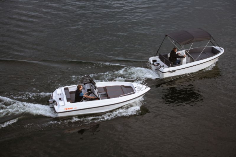 Den öppna planlösningen, durkens halkskyddade yta och den höga friborden gör Terhi 450 Sloep framför allt praktisk och trygg. Mittbänken kan fällas åt sidan, vilket ger dig mer utrymme i mitten av båten för fri rörlighet. Terhi 450 Sloep - modellens kompakta styrkonsol är placerad i mitten av båten, vilket ger föraren både god sikt i alla riktningar och utmärkt manövrerbarhet, även då båten körs ensam.