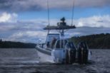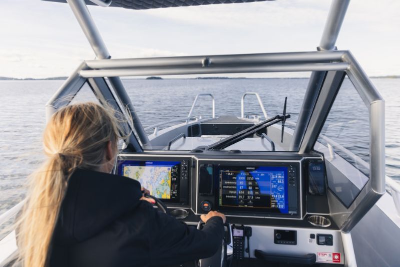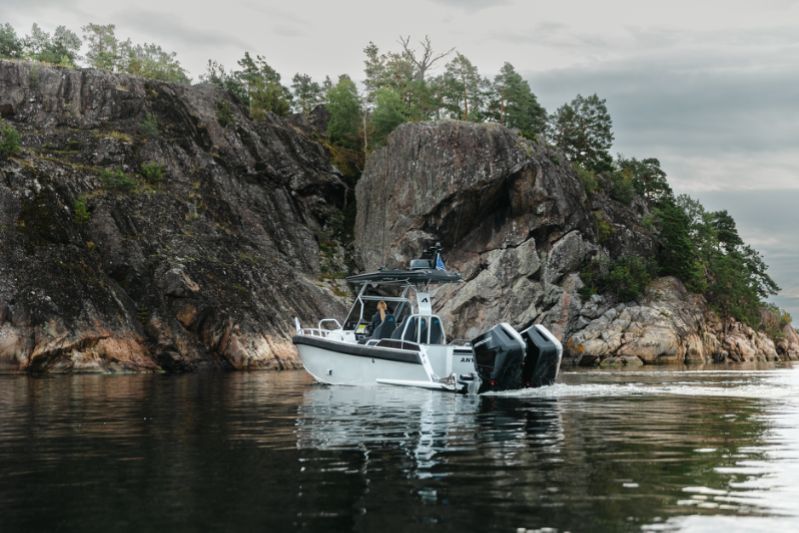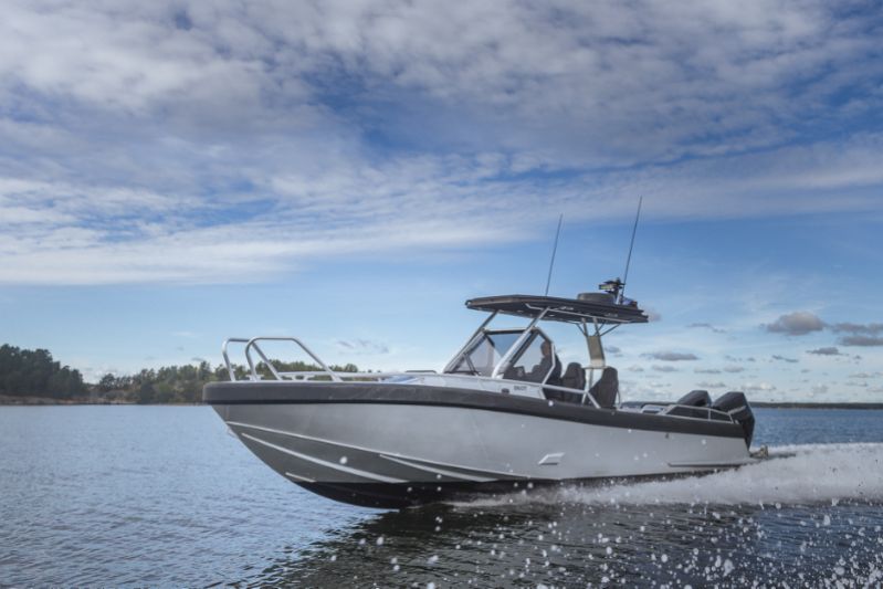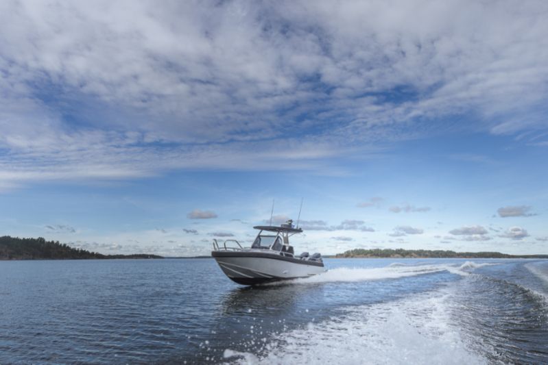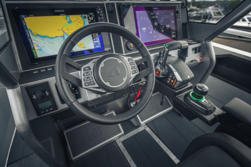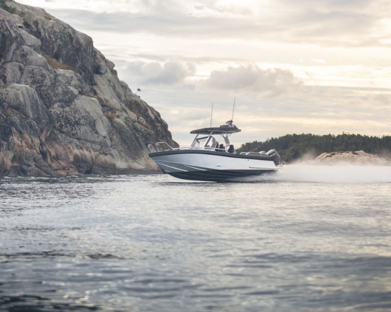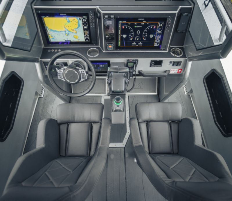 860 T är kanske den tuffaste av trion. Speciellt med sina dubbla Mercury V10-utombordare på 400 hästkrafter och svartmålade T-top-tak utstrålar den en känsla av äventyr och maskulinitet. Och utseendet ljuger inte.